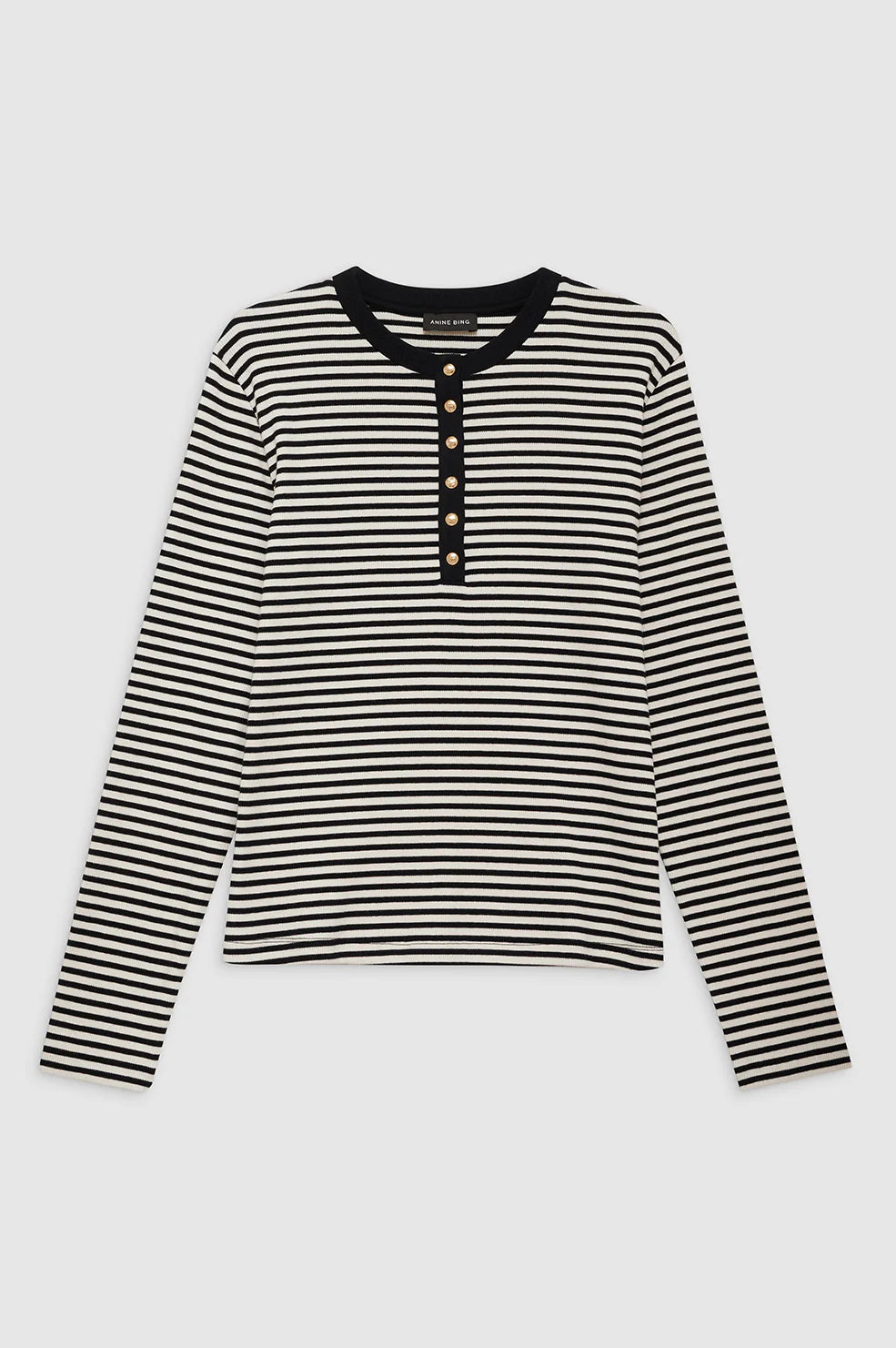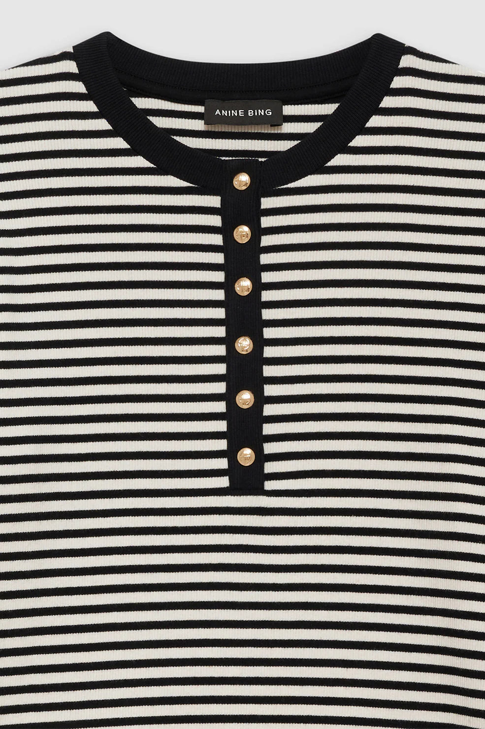 The Alessia Long Sleeve Tee is a modern Henley made from a dense cotton-spandex blend with an all-over ribbed texture and a soft hand. This elevated basic features a high crew neckline and gold monogram snap buttons along the front placket.