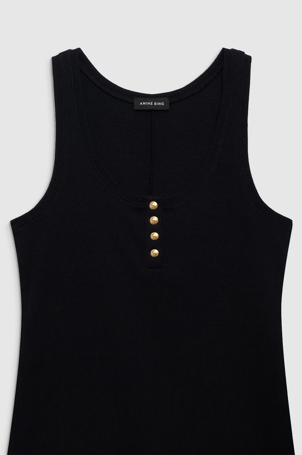 A modern, Henley-inspired tank midi dress made from a dense cotton-spandex blend with an all-over ribbed texture and a soft hand. This casual silhouette features a round neckline and gold monogram snap buttons along the front placket.