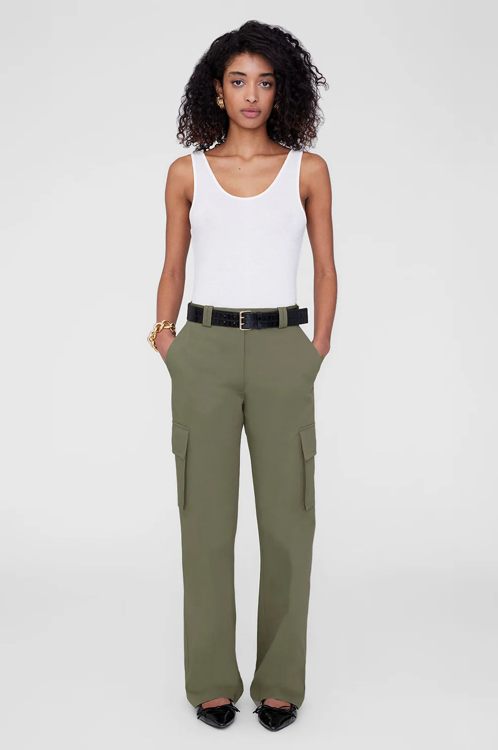 A utility-inspired bottom constructed from a midweight textured wool blend with a dry, slick hand. The Dayton Cargo Pant is half lined to the knee and features a relaxed, straight wide leg with oversized cargo pockets and back patch pockets. Complete with a front zip opening with a hook and bar closure and functional belt loops.