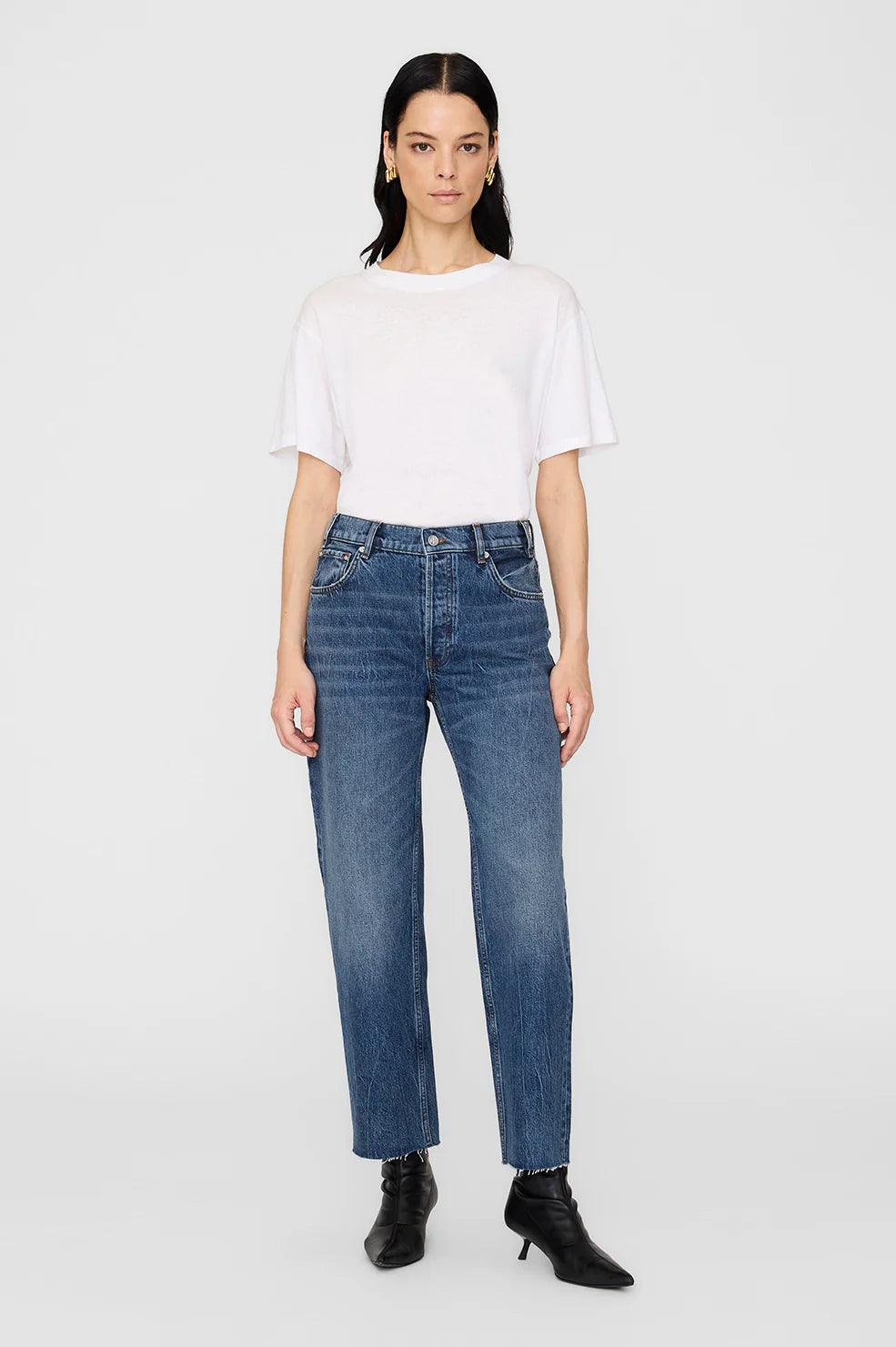 The cropped, boyfriend-inspired Gavin Jean is constructed from midweight 100% regenerative cotton without stretch in a medium blue wash.