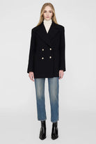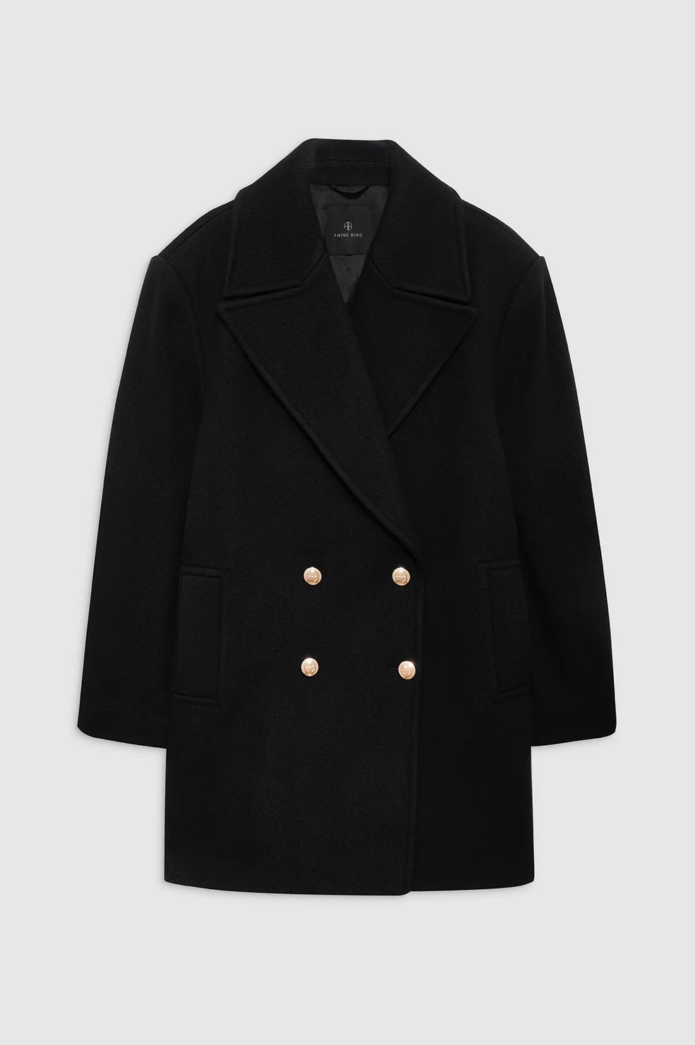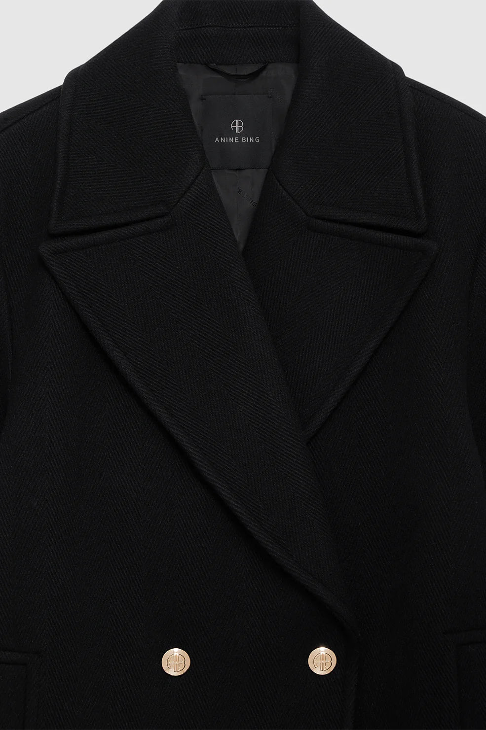 A traditional peacoat made from a heavyweight wool blend with a herringbone texture and soft hand. The Glenn Peacoat is fully lined and features a double-breasted closure with four gold ANINE BING branded buttons and vertical front welt pockets.
