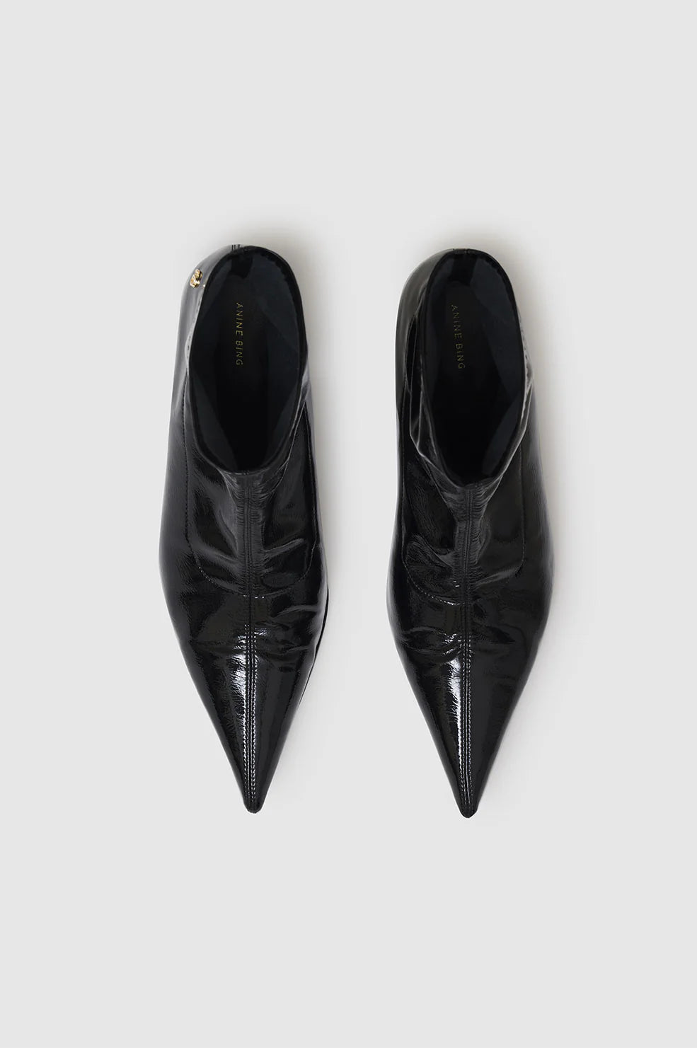 Modern sock booties made from stretch vegan leather with a high-shine finish and subtle crinkled texture. The Hilda Boots' sleek construction features a sharp pointed toe, angular kitten heel, and high-shine outsole. Accented with gold-tone ANINE BING hardware at each heel.