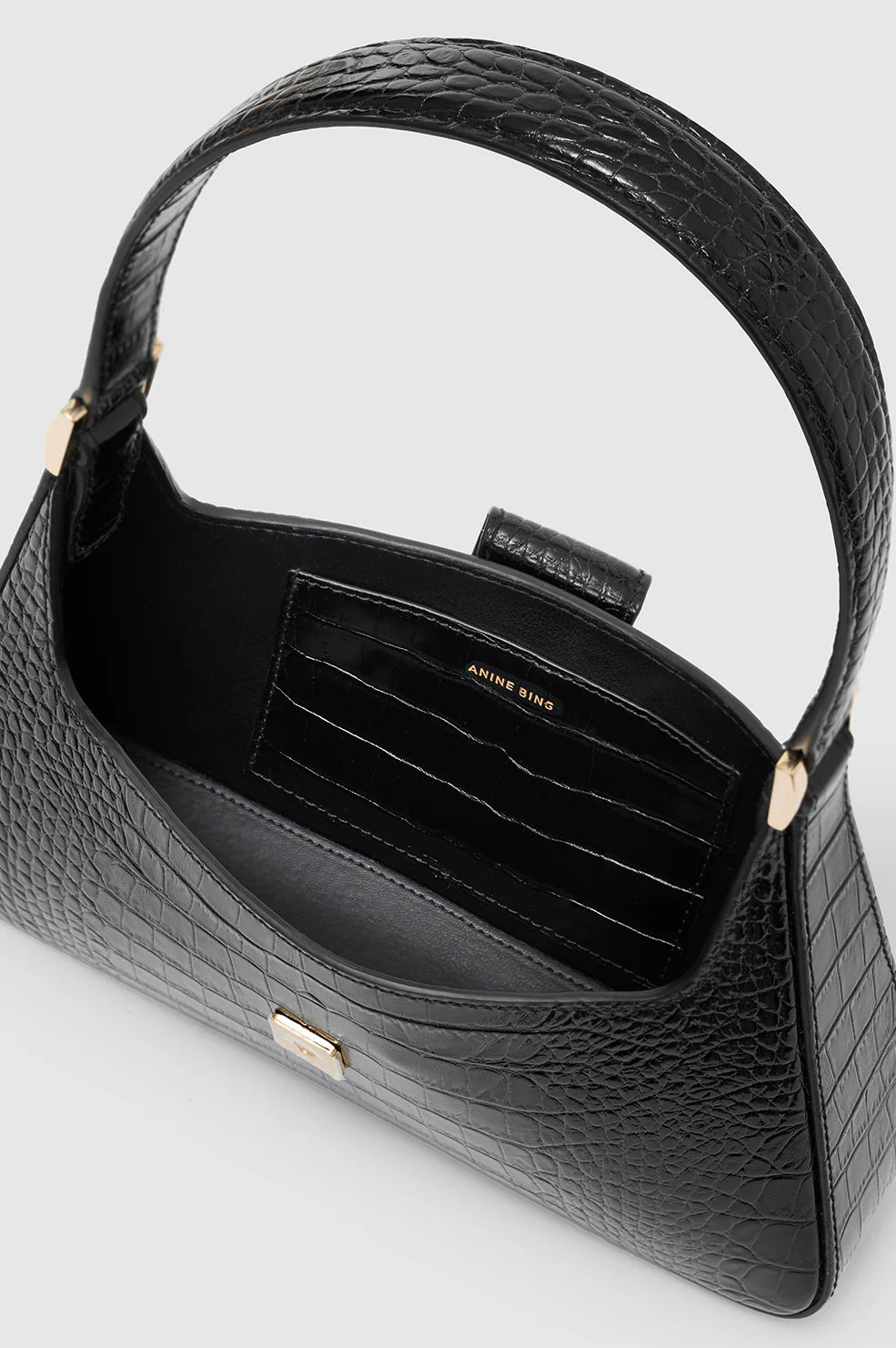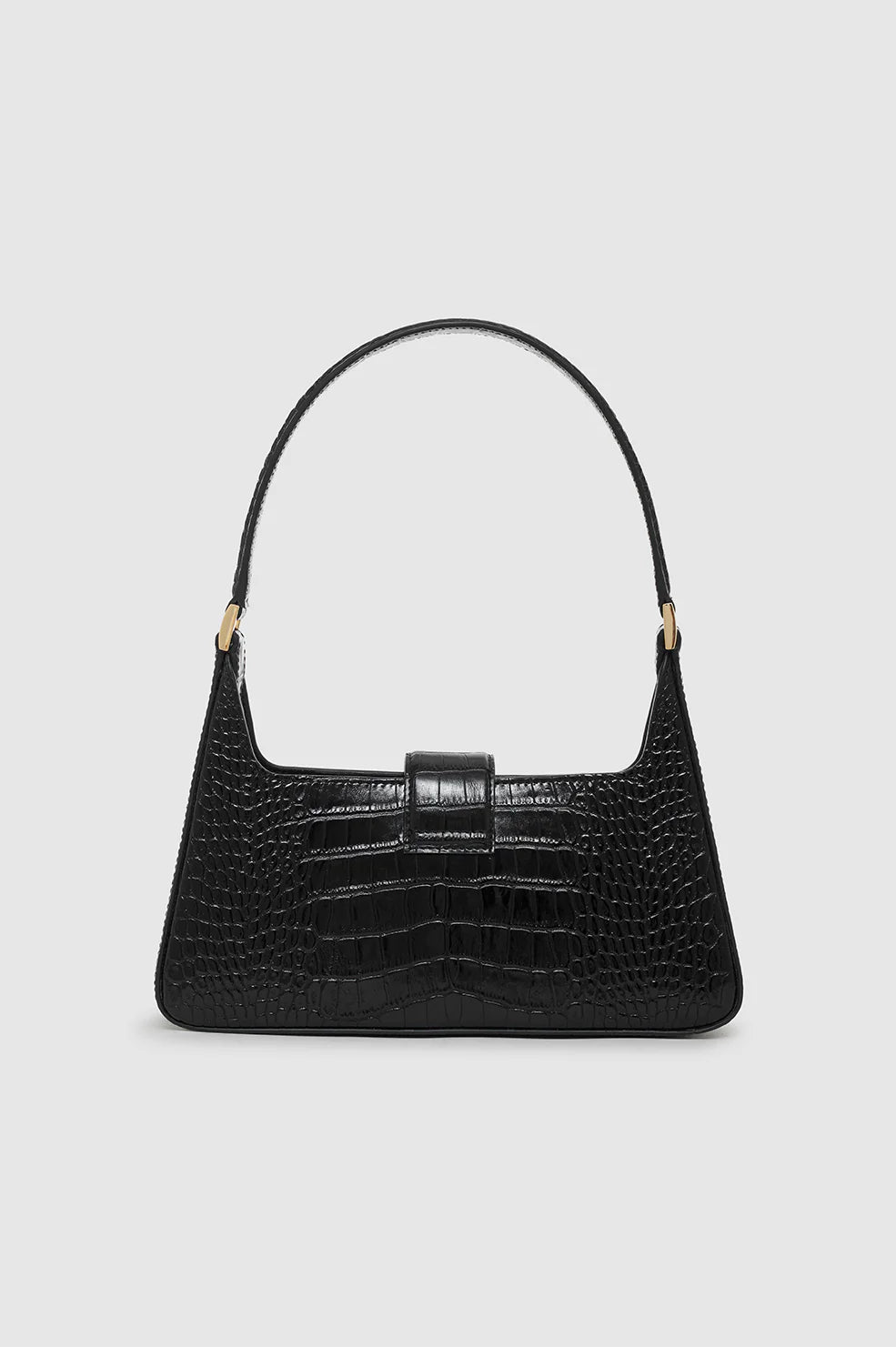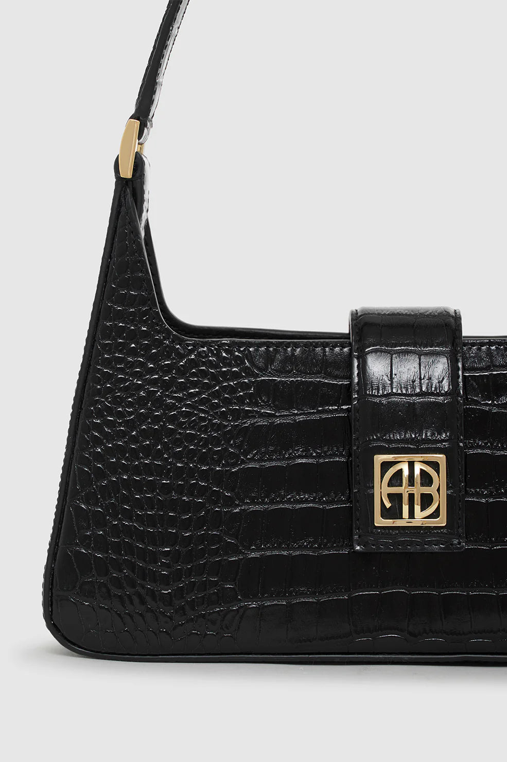 A timeless handbag crafted from shiny 100% leather stamped with faux croco-embossed texture. The Lou Shoulder Bag features a leather tab and custom square magnetic closure, adorned with our signature framed ANINE BING monogram in exceptional gold hardware. Complete with a classic shoulder strap secured by custom square rings and a single interior slip pocket.