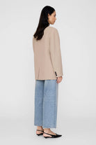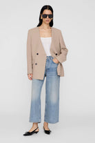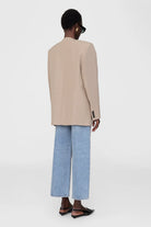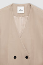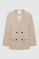 A constructed, collarless blazer in a lightweight, linen-viscose suiting fabrication with a classic oversized fit and double-breasted closure with four horn buttons.