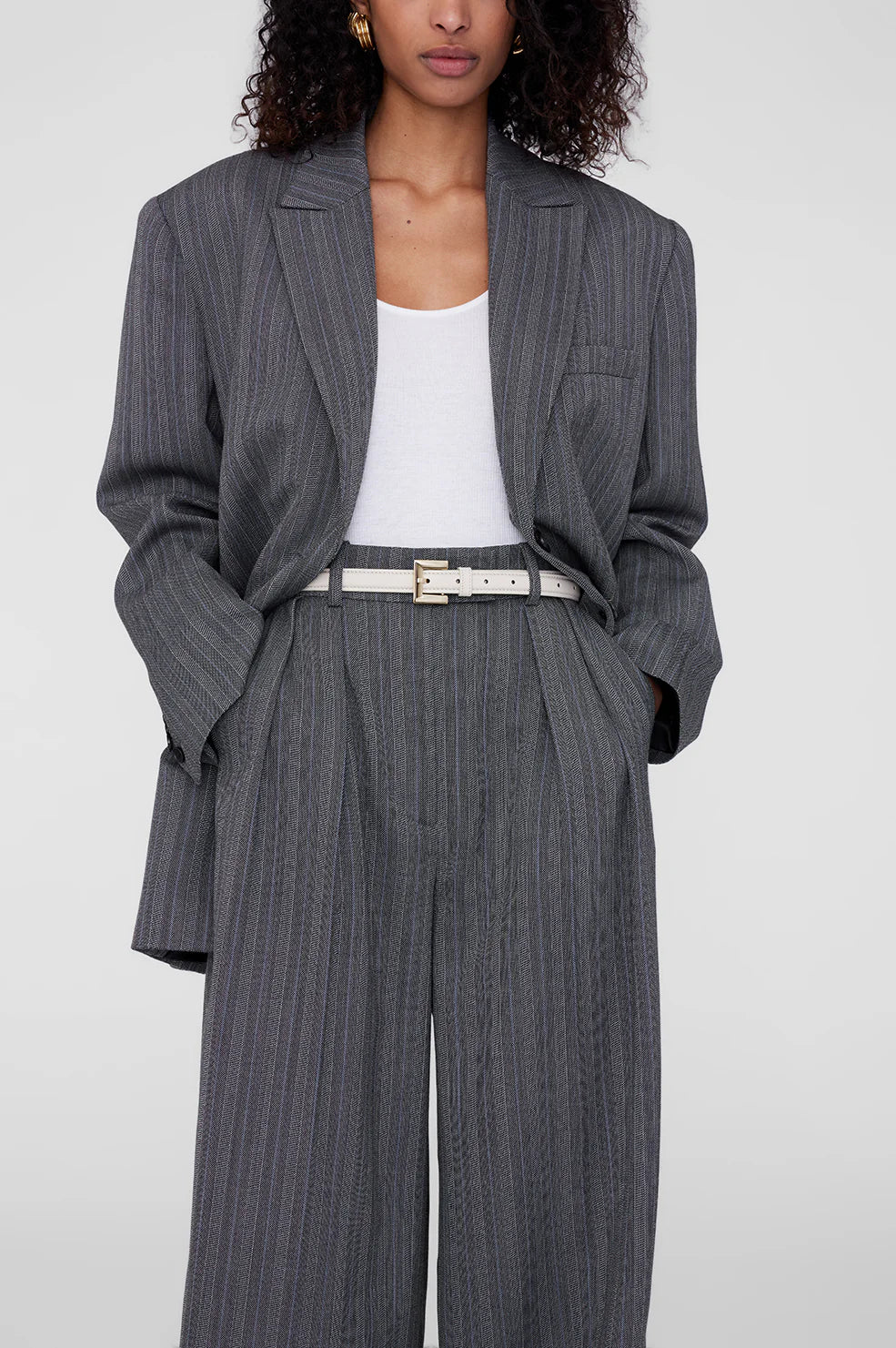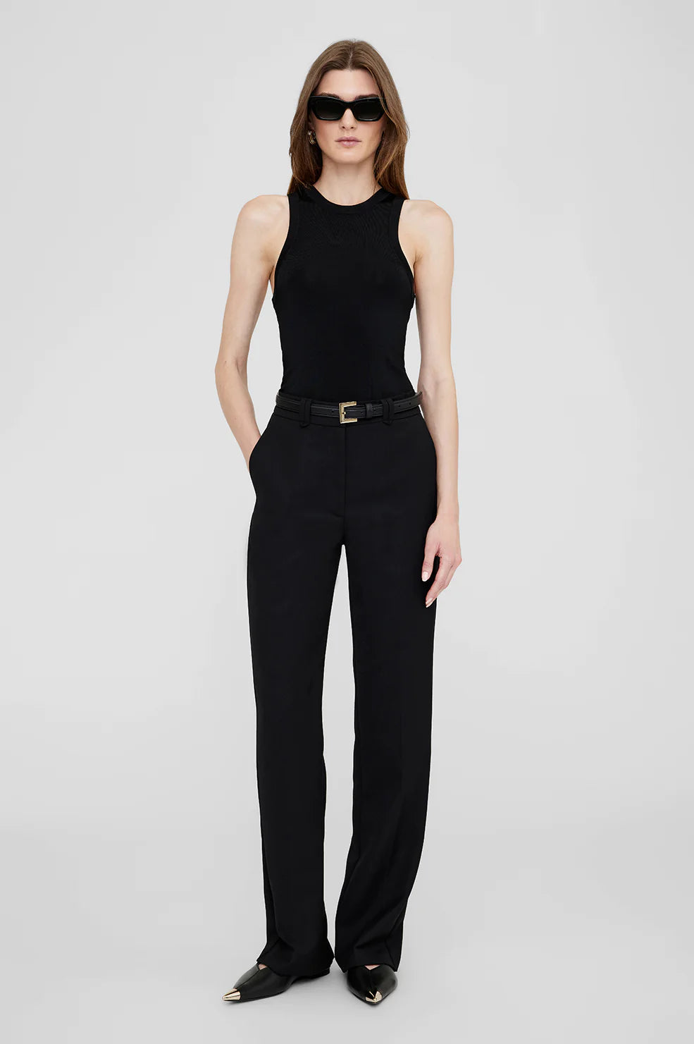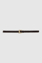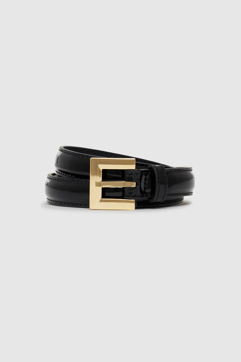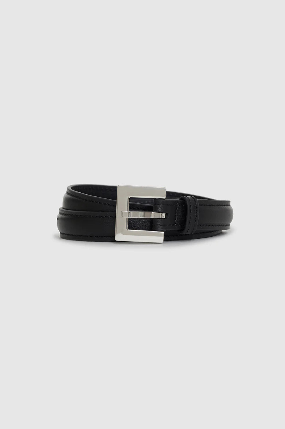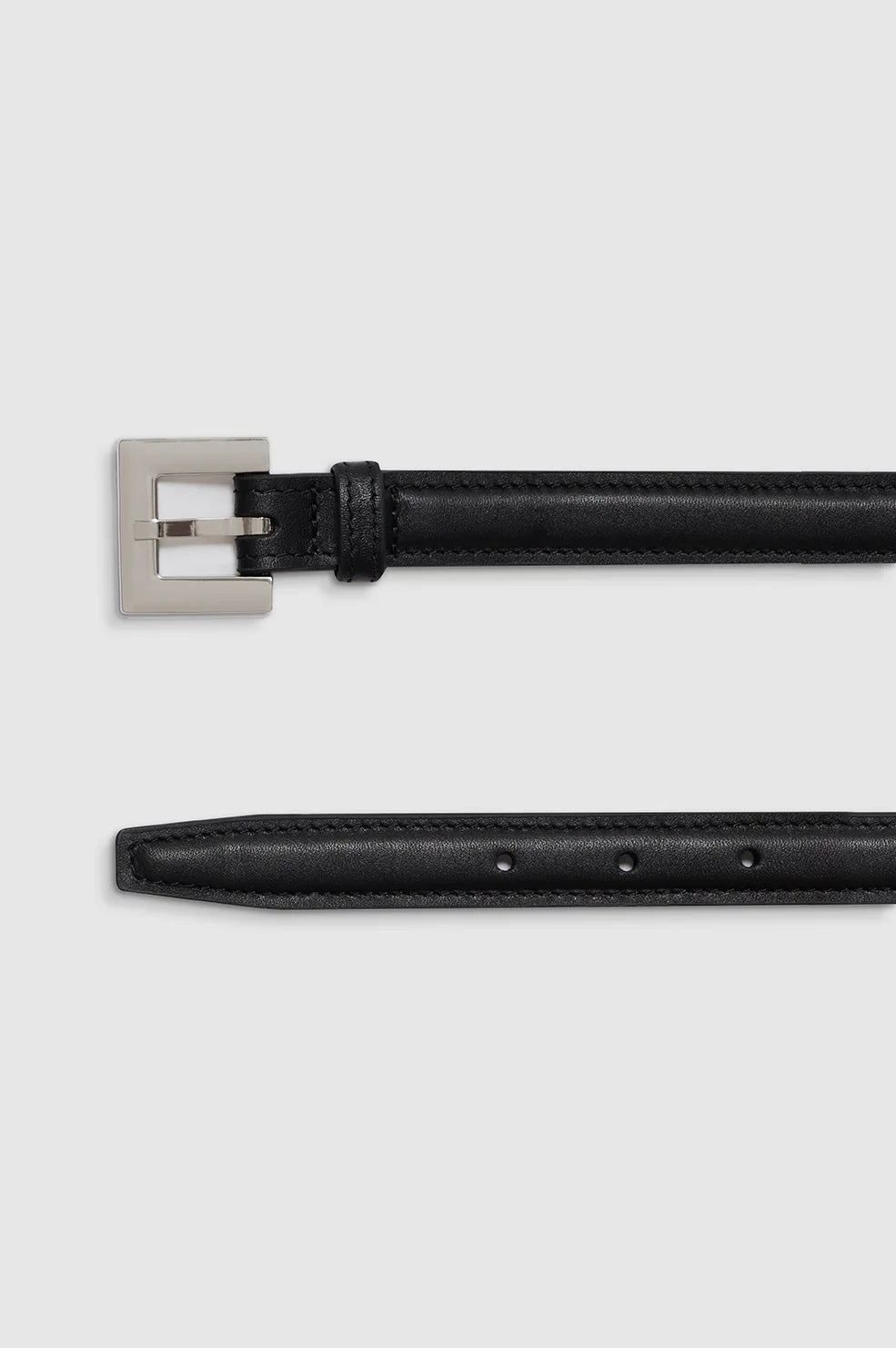 The Nicola Belt is crafted from black 100% cow leather with a slight sheen. This everyday style is slightly padded and features a custom square-shaped buckle in 14k gold-plated zinc engraved with subtle ANINE BING branding.
