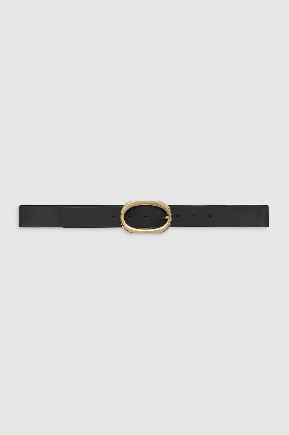 An everyday belt made from smooth 100% cow leather in black featuring a timeless, signature-link buckle with subtle ANINE BING branding.