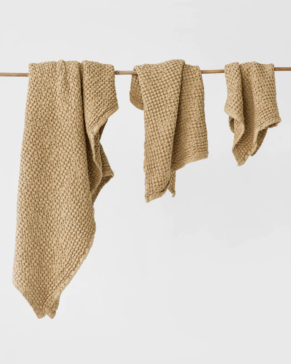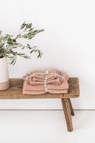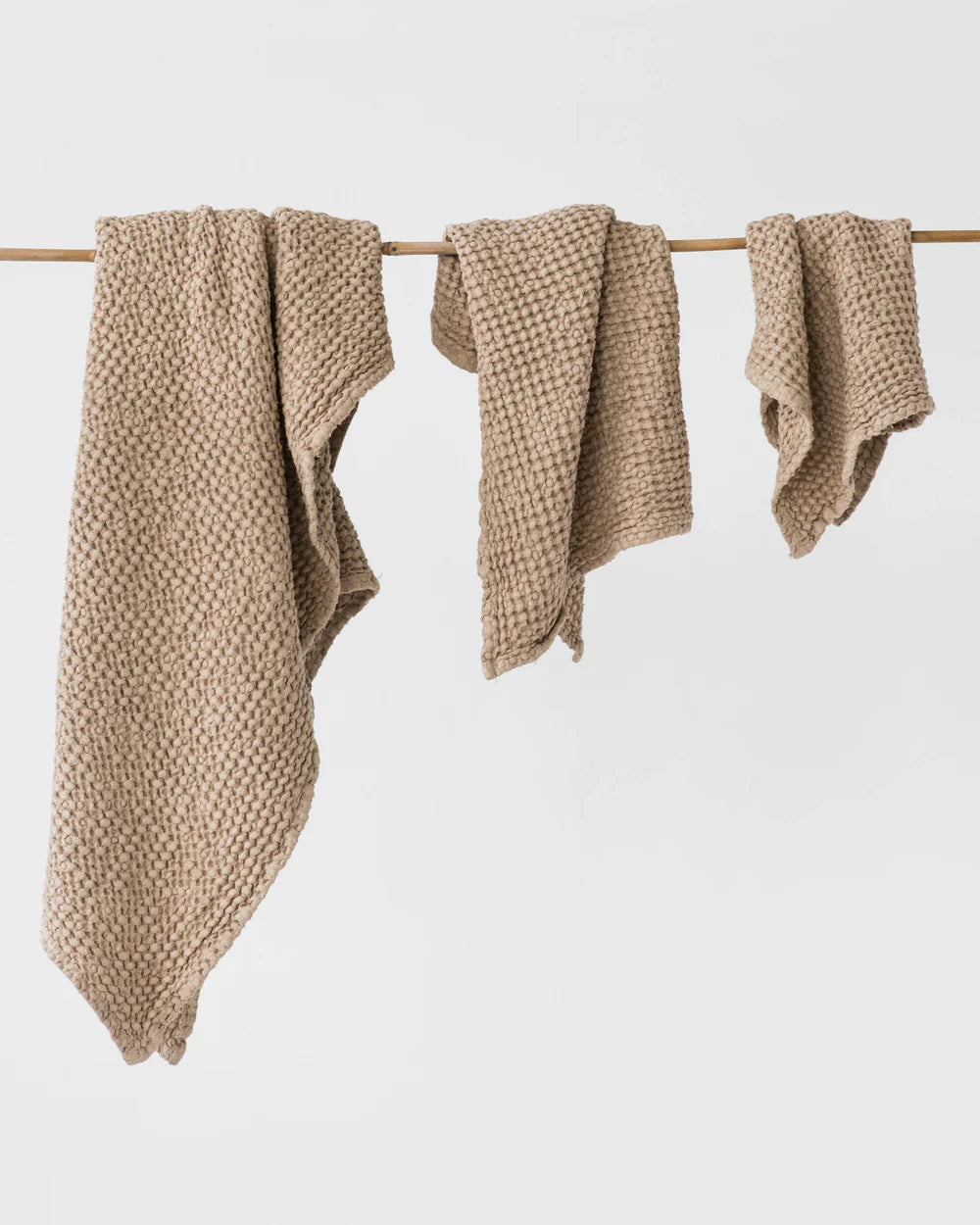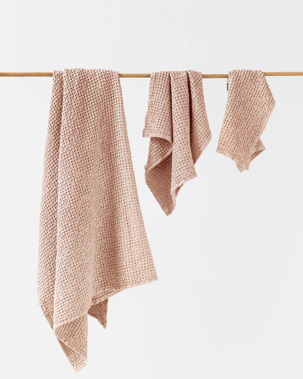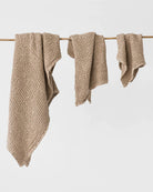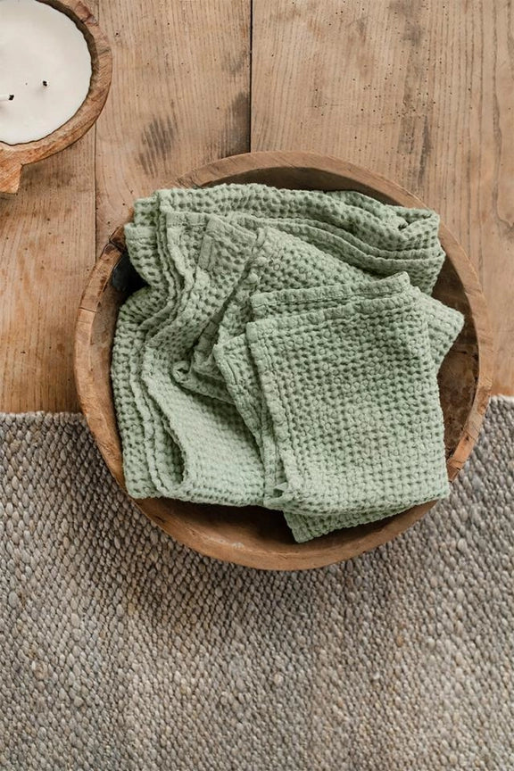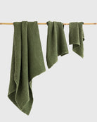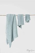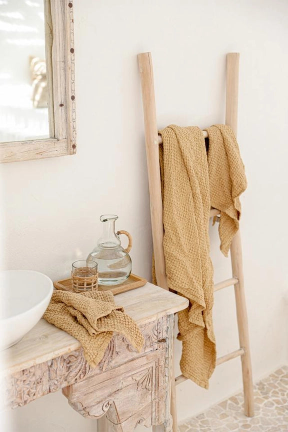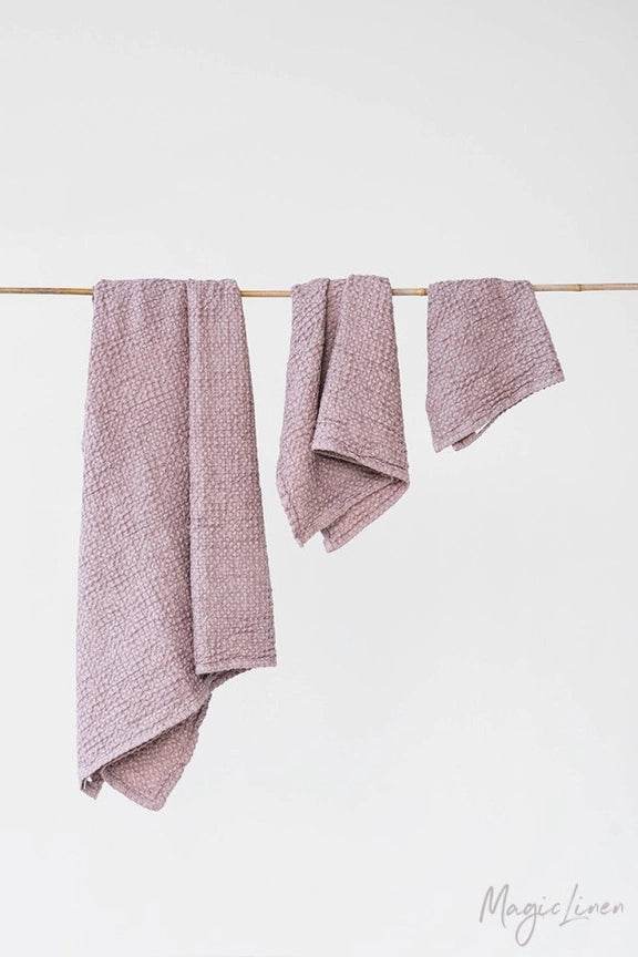 Linen-cotton blend towel set in various colors. The puffy waffle weave not only increases absorbency, but also gently exfoliates your skin. Linen is naturally antimicrobial and allows for easy airflow ensuring your towels dry quicker and stay free of mildew, germs or unpleasant odors. Wrap yourself in luxury!