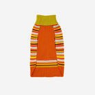 Textured multi-color stripe knit dog sweater with ribbed underside, turtleneck collar, and harness keyhole on back. Hypoallergenic, washable knit.