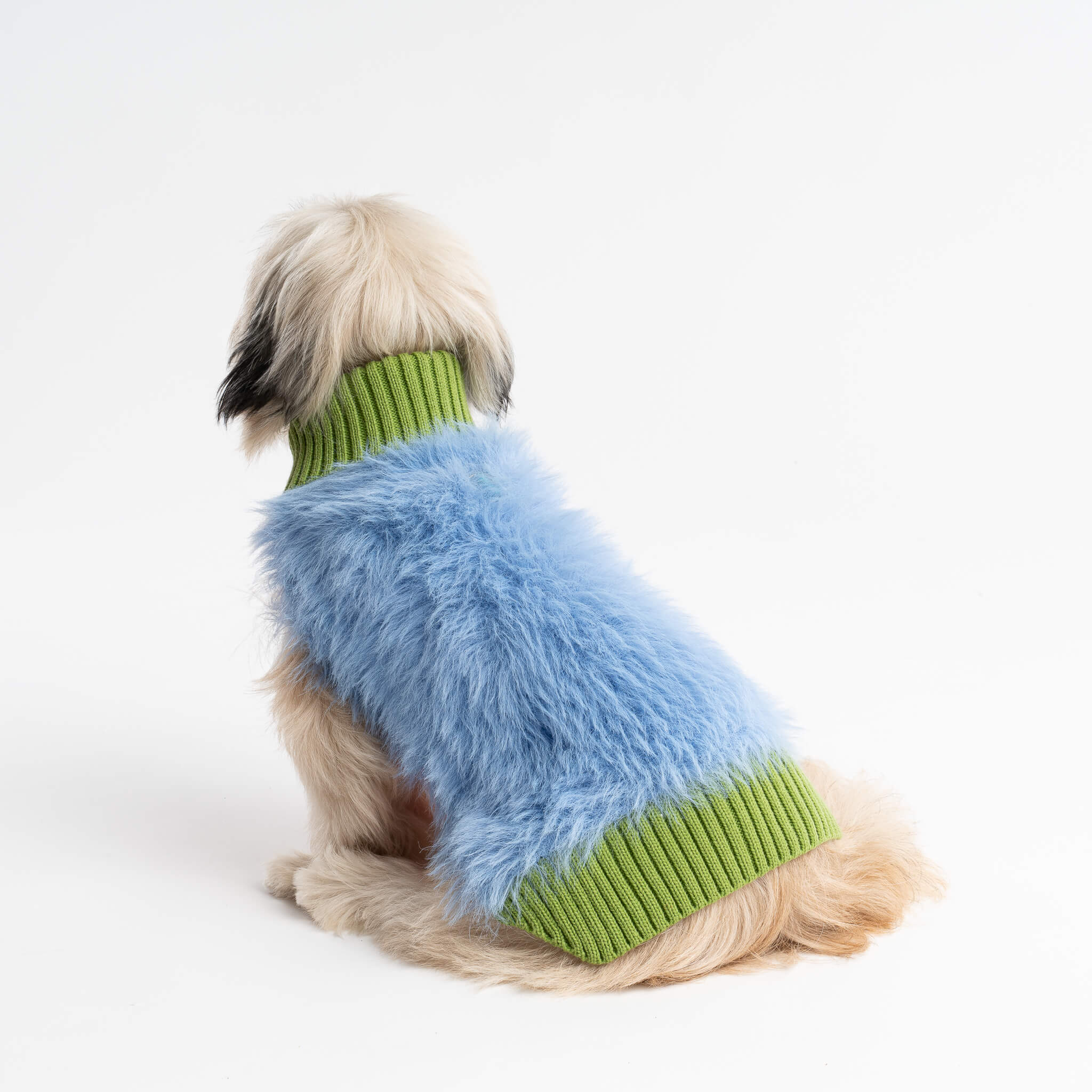 Soft faux fur knit dog sweater with contrast ribbed underside and turtleneck collar. Harness keyhole on back. Hypoallergenic, washable knit.