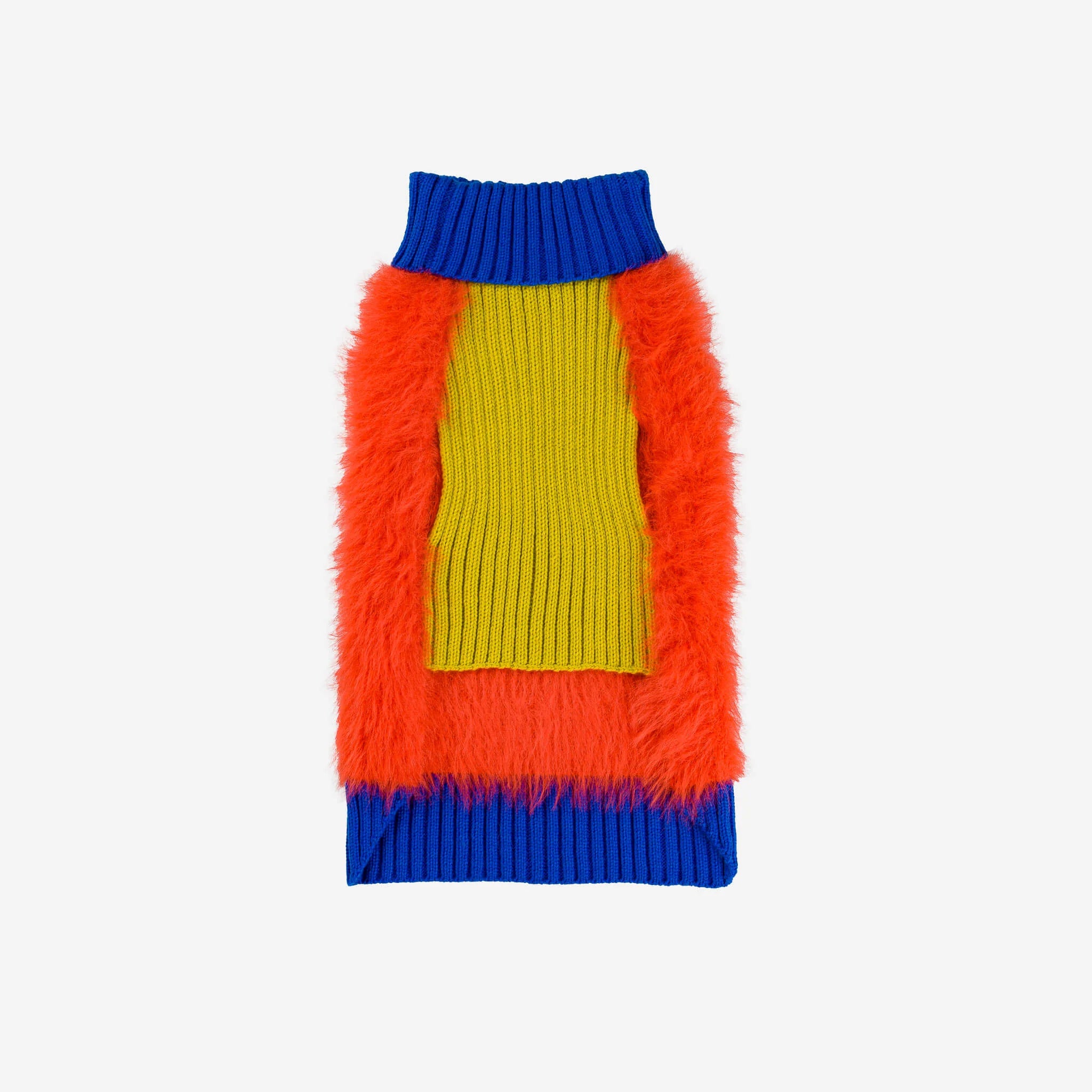 Soft faux fur knit dog sweater with contrast ribbed underside and turtleneck collar. Harness keyhole on back. Hypoallergenic, washable knit.