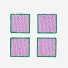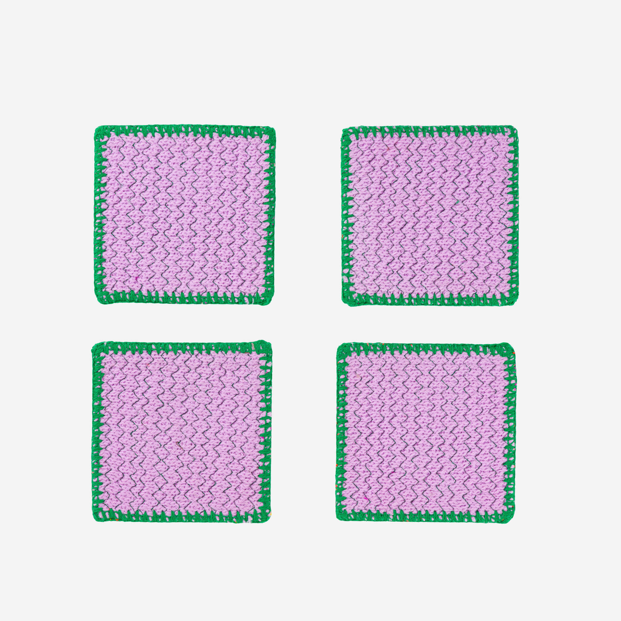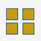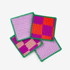 For your next dinner party or cute coffee table upgrade. Set of 4 mix-and-match reversible knit coasters made from deadstock material. Each coaster makes a matching set with solid color on one side and a mix of patterns (made from repurposed fabric) on the back. Contrast zig-zag stitching is sewn by hand. Pattern placement in each set is unique.