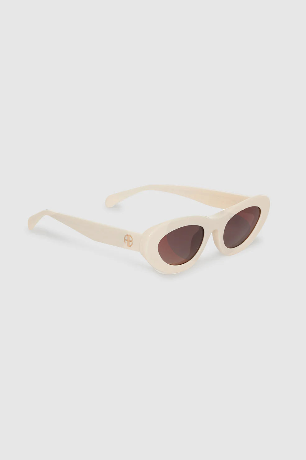 The Roma Sunglasses feature an oval, cat-eye shape with acetate frames and grey gradient lenses polarized with UV400 protection. Accented with a gold-tone ANINE BING monogram at each temple.